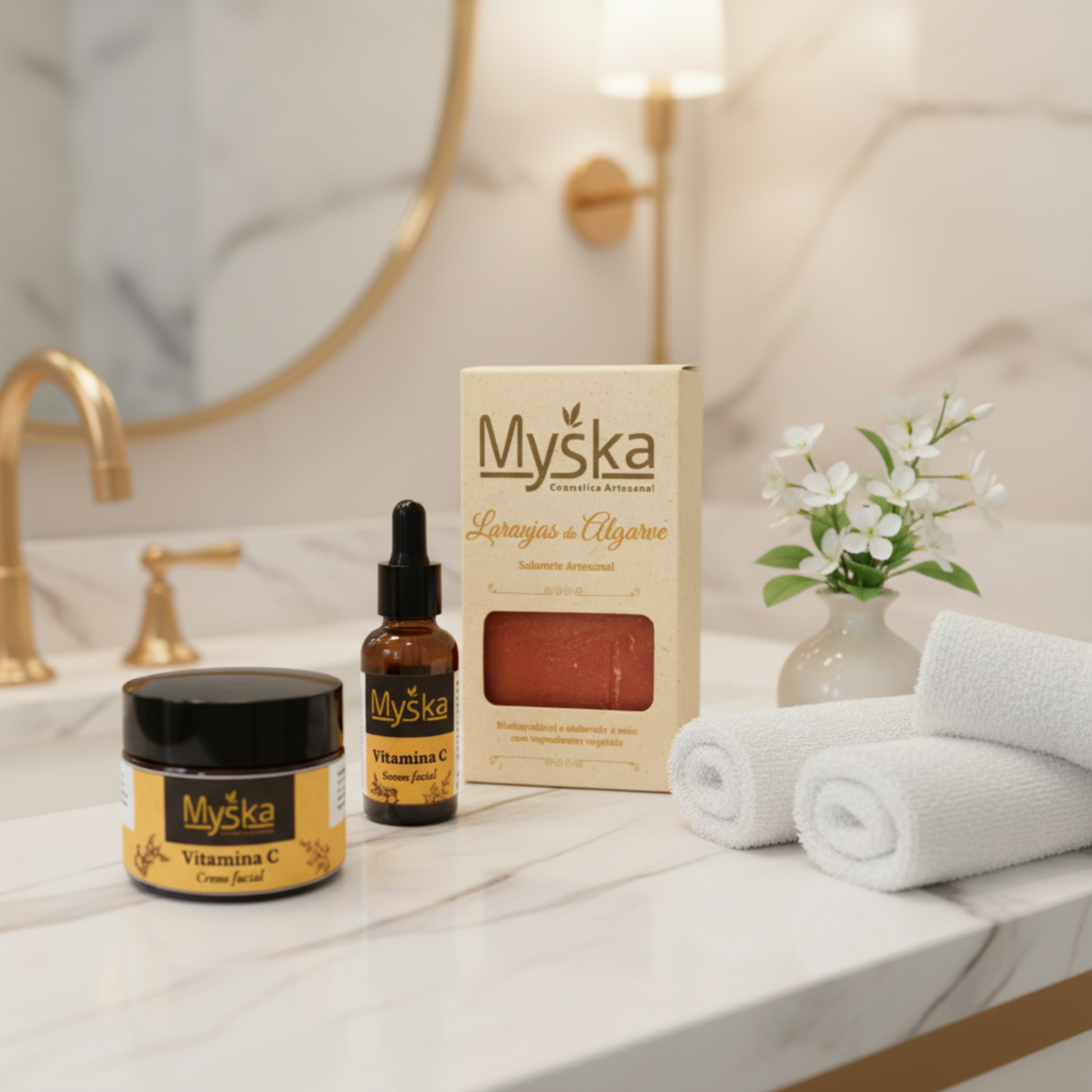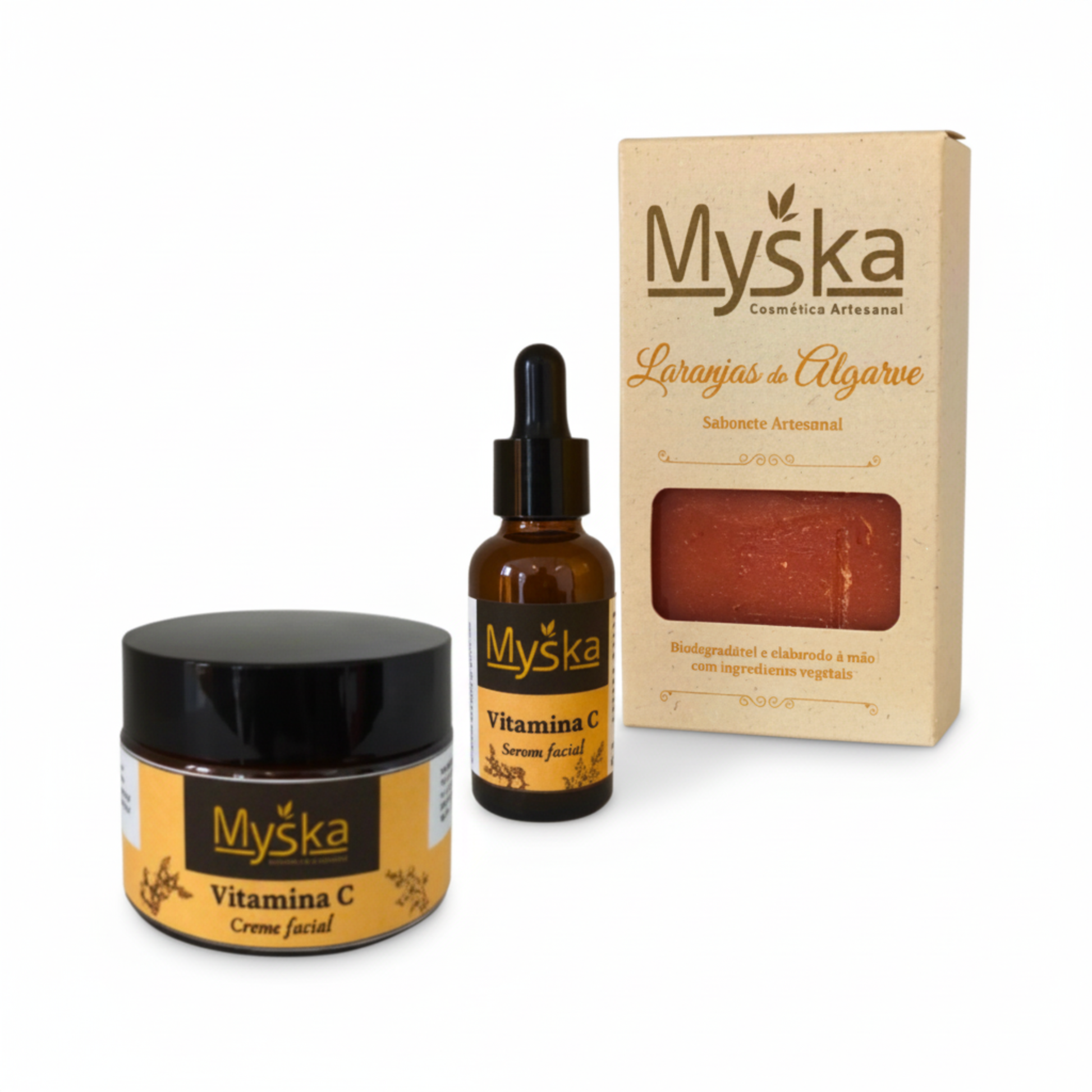 • Sérum Facial Vitamina C: aplicar 2–3 gotas no rosto limpo e seco, preferencialmente à noite, antes do creme facial.